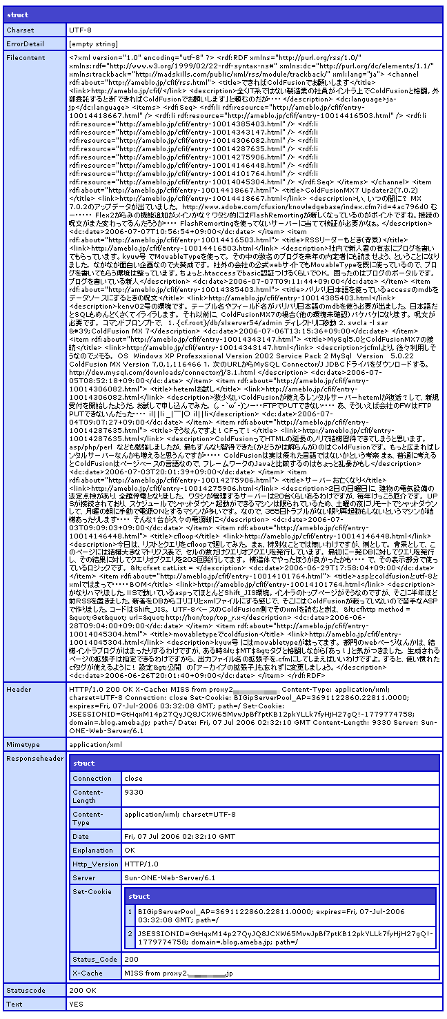 ところで、#xmlDoc.rss.channel.item[1].description.XmlText# とすると、MovableTypeのRSSの場合、タグも全部付いてきます。それはそれでありがたかったりしますが、邪魔な場合も。
