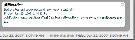 ColdFusionをデバッグモードにしておけば、ほとんどのエラーはブラウザ上ですぐ確認できるのですが、たまにHTTP500が出ると、何のエラーが出たのかわからないため、Application.logとかを見る必要があります。