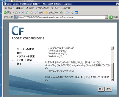 設定用のcfadministratorページが立ち上がって、環境移行ウィザードっぽく進む。